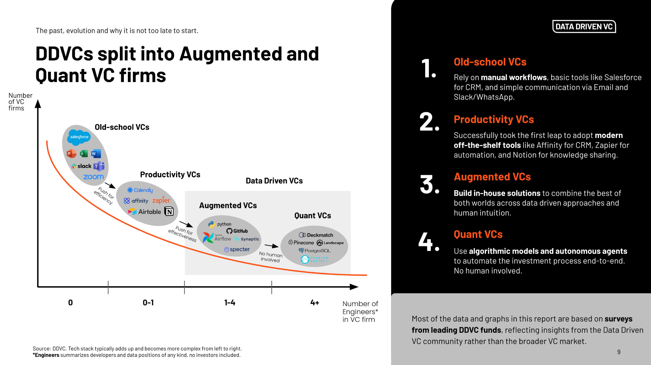 As the industry evolves, firms are increasingly differentiating based on their tech maturity and data capabilities. Data Driven VCs are split into three categories - each representing a step forward in efficiency and effectiveness:Old-school VCs rely on manual workflows and legacy tools.Productivity VCs adopt off-the-shelf tools to streamline tasks.Data Driven VCs go further. These firms develop their own scalable solutions to capture data, automate workflows, and bring the core of their business in-house. This category includes both Augmented VCs, who blend internal tools with human judgment, and Quant VCs, who pursue full automation through algorithms and AI agents.As the number of engineers grows, so does the sophistication - and competitive edge - of the fund. The future of VC is being built by those who embrace this shift.