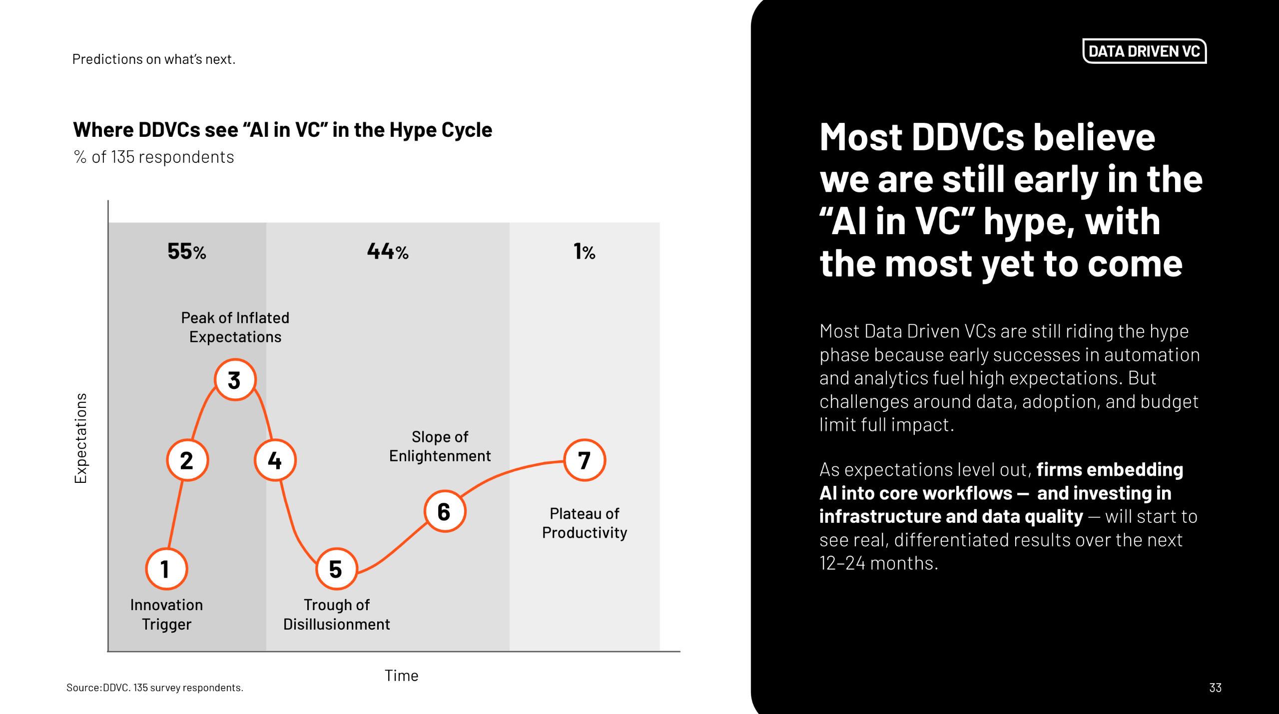 2025 marks a new moment: the year of agents. We're entering an era where autonomous AI agents won’t just support workflows - they’ll actively execute tasks, make decisions, and adapt to dynamic environments. For leading VCs, this represents an opportunity to augment every stage of the value chain - from sourcing and diligence to portfolio support and fund operations.And yet, we’re still early. Over 99% of DDVCs place themselves before the true “plateau of productivity.” Challenges like data integration, infrastructure maturity, and budget constraints remain - but so does massive upside.The next 12–24 months will be critical in value generation. Funds that embed AI into their core operations, invest in high-quality data, and build around intelligent agents will unlock new levels of speed, insight, and scalability. These aren’t just productivity gains - they're compounding advantages.