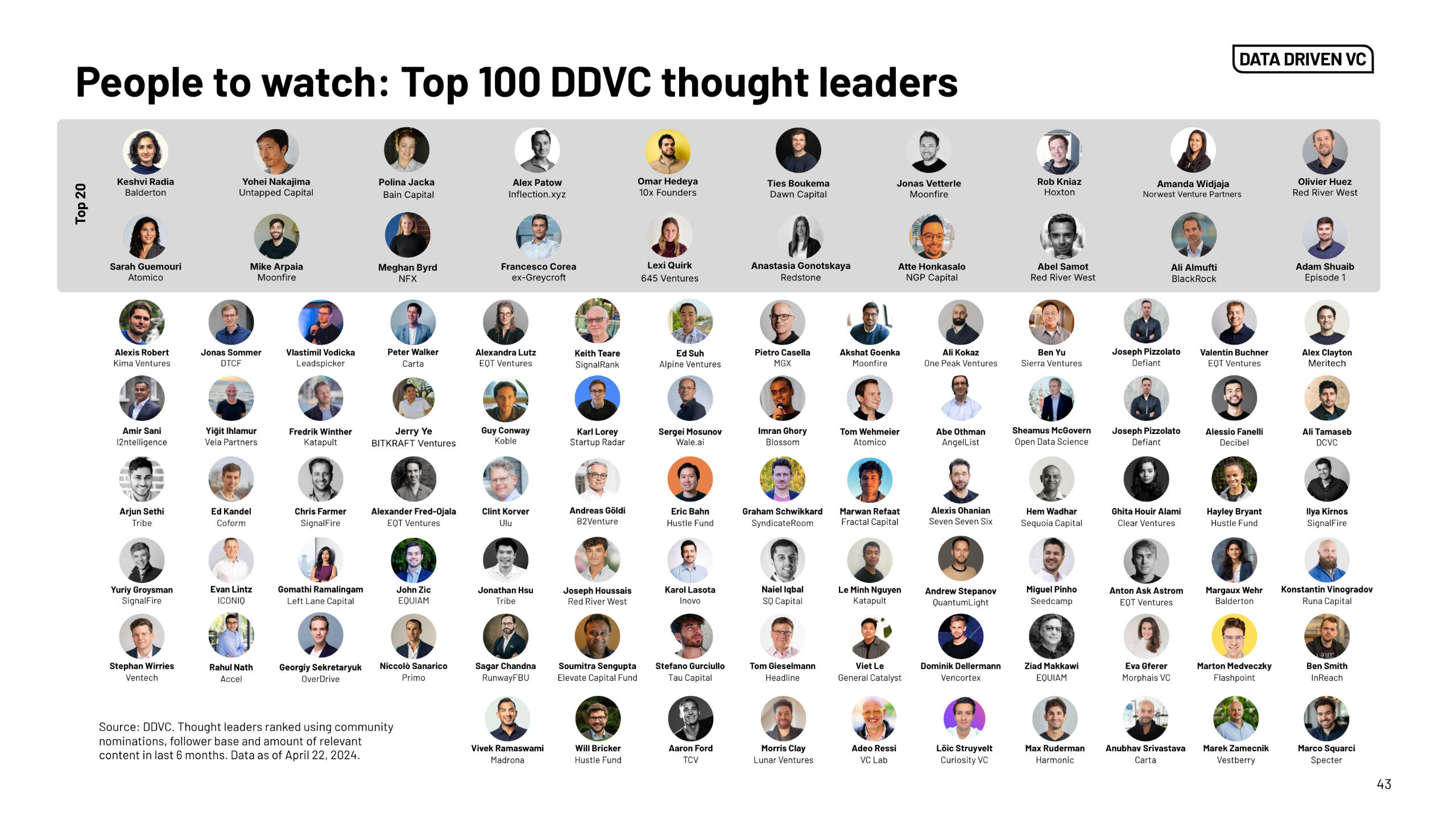 Becoming more data-driven in VC offers a clear edge - but the how matters just as much as the why. That’s why we’ve dedicated an entire chapter to practical guidance: actionable tips, proven insights, and curated tools to help you start - or scale - your journey as a Data Driven VC.To inspire and guide that journey, we’re also spotlighting the Top 100 thought leaders driving innovation in this space. These are the people challenging legacy thinking, building modern stacks, and leading the charge toward a more efficient, effective, and inclusive future of venture.